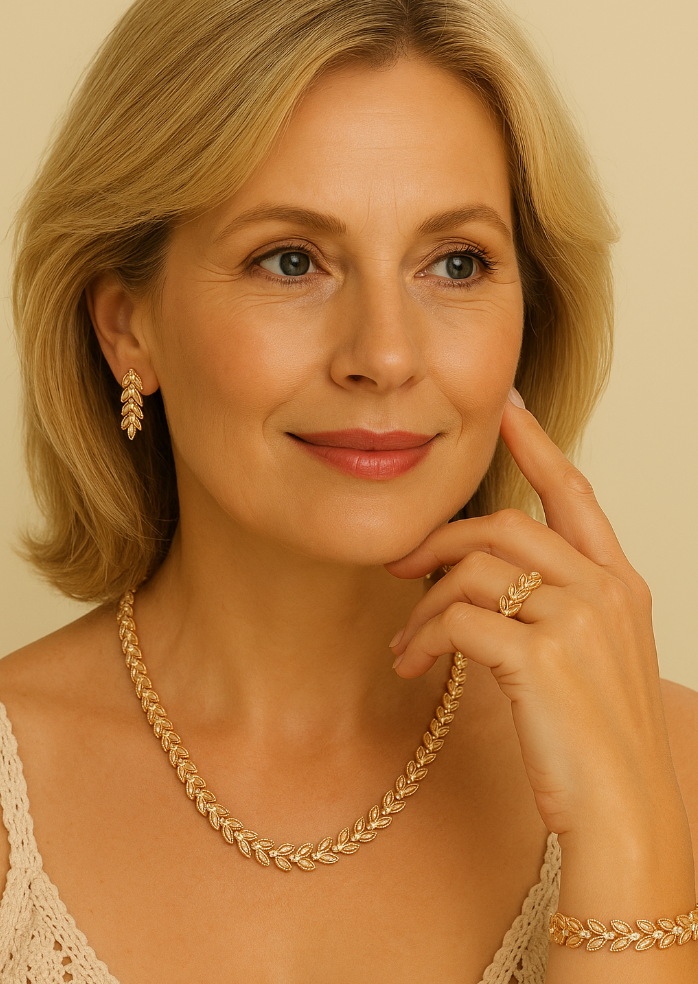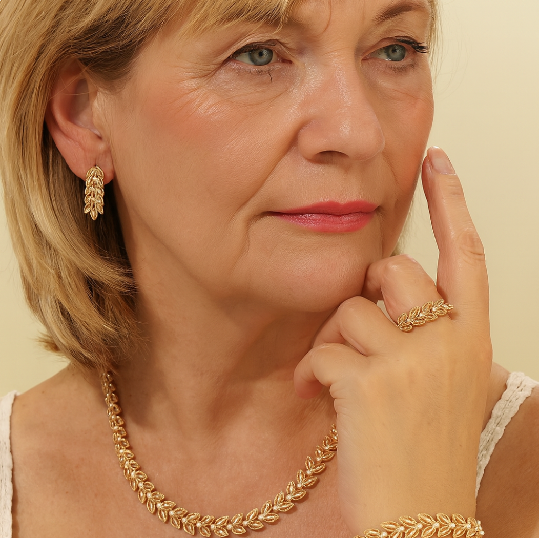 Inspirée par des feuilles dorées — symbole d’élégance et de féminité — la collection Éléonore™ offre un volume subtil qui sublime le cou, le poignet et le visage sans jamais être trop imposant.