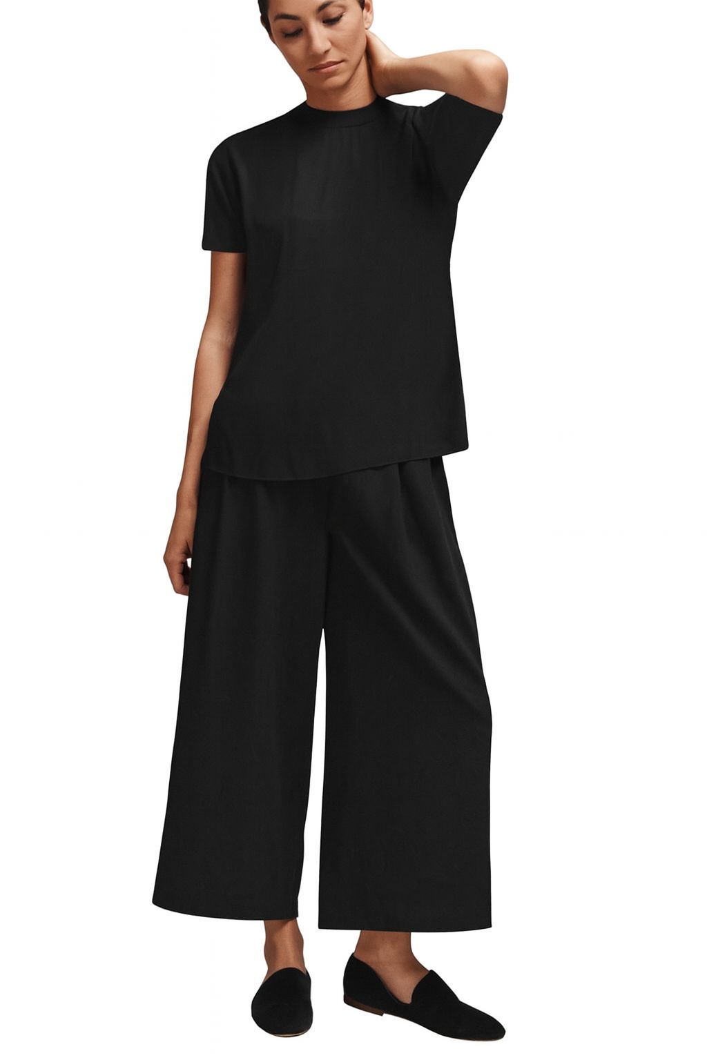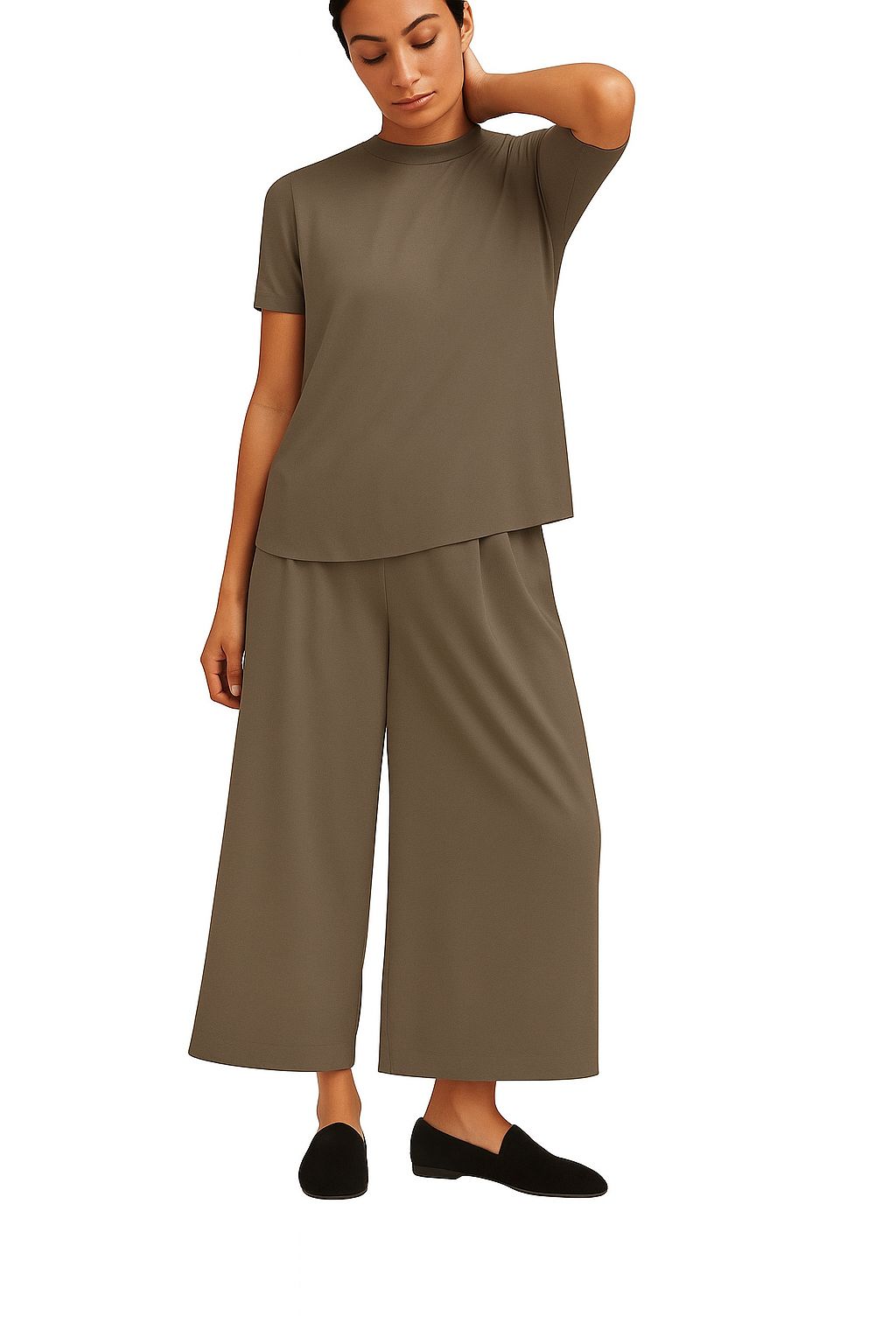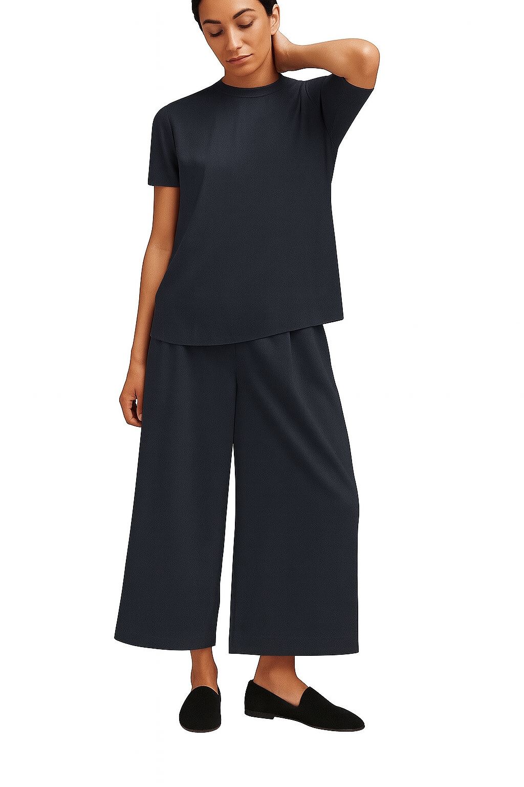 Ensemble femme deux pièces : haut à manches courtes et pantalon avec taille élastiquée.