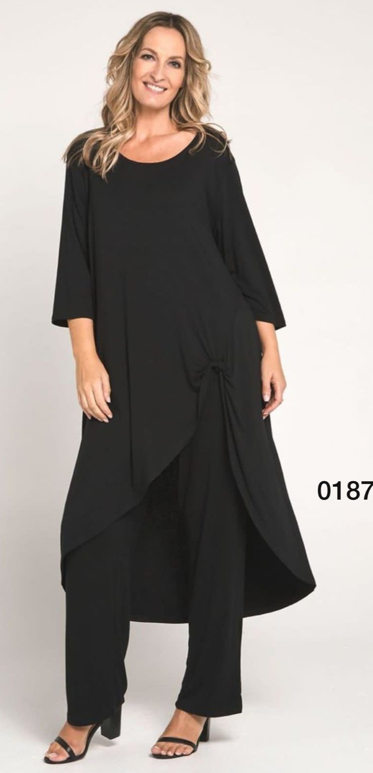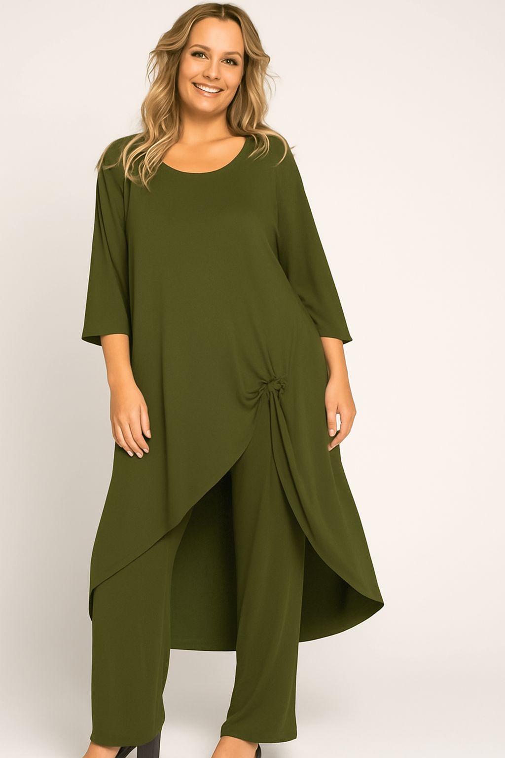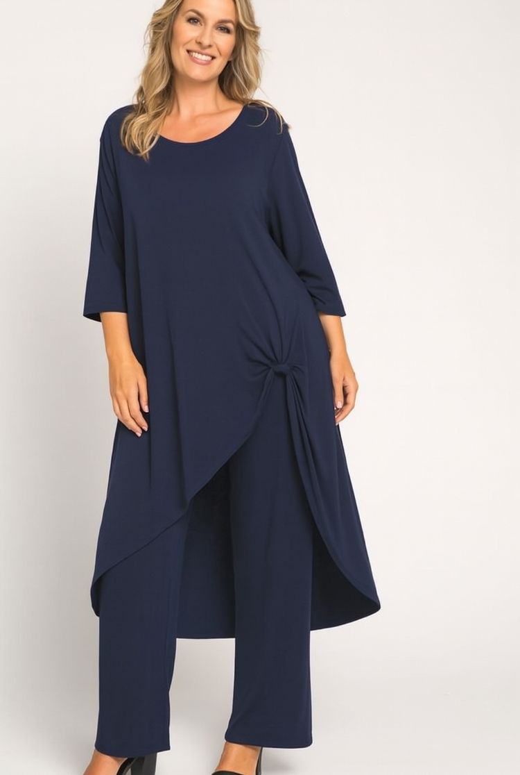 Ensemble féminin deux pièces, élégant et polyvalent, composé d’une tunique asymétrique avec un nœud latéral et d’un pantalon droit coordonné. Conçu dans une étoffe douce et légère, il garantit confort et style en toute occasion. Parfait pour les cérémonies, les événements ou les soirées spéciales, il apporte une touche raffinée et élancée à la silhouette.